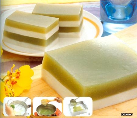 2,將材料(3)中的抹茶粉用少許冷水調(diào)拌開來,再與其余材料(3)混合,置于爐子上邊煮邊攪拌,帶沸騰時,快速攪拌至弄抽狀且呈透明色,即可以關(guān)火3,待圖一凝結(jié)了,就倒入圖二,待凝結(jié),即可以食用,食用時切塊!