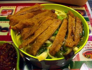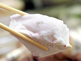 將雞胸肉縱切成絲,用刀背輕輕敲打,撒上精細食鹽和黃酒,放置4-5分鐘。雞蛋打入碗中,加冷水150毫升,調(diào)入小麥粉,迅速用力攪勻成蛋糊。雞肉絲蘸上蛋糊,在熱油中炸熟,撈出放在粳米飯上,撒以綠茶末、細鹽及干紫菜絲即成。
