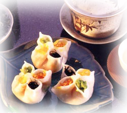 做法:先將胡蘿卜切成小丁,茶葉泡開后切成末;將胡蘿卜丁、茶葉末、青豆、玉米粒用適量鹽、雞精、胡椒粉(根據(jù)自己的喜好決定)、蠔油、白糖、麻油調(diào)味后拌勻;加入少量面粉、鹽和油和成面團。最后將和好的面搟成薄皮,包入調(diào)好的餡,做成餃子,上屜蒸5分鐘左右即成。