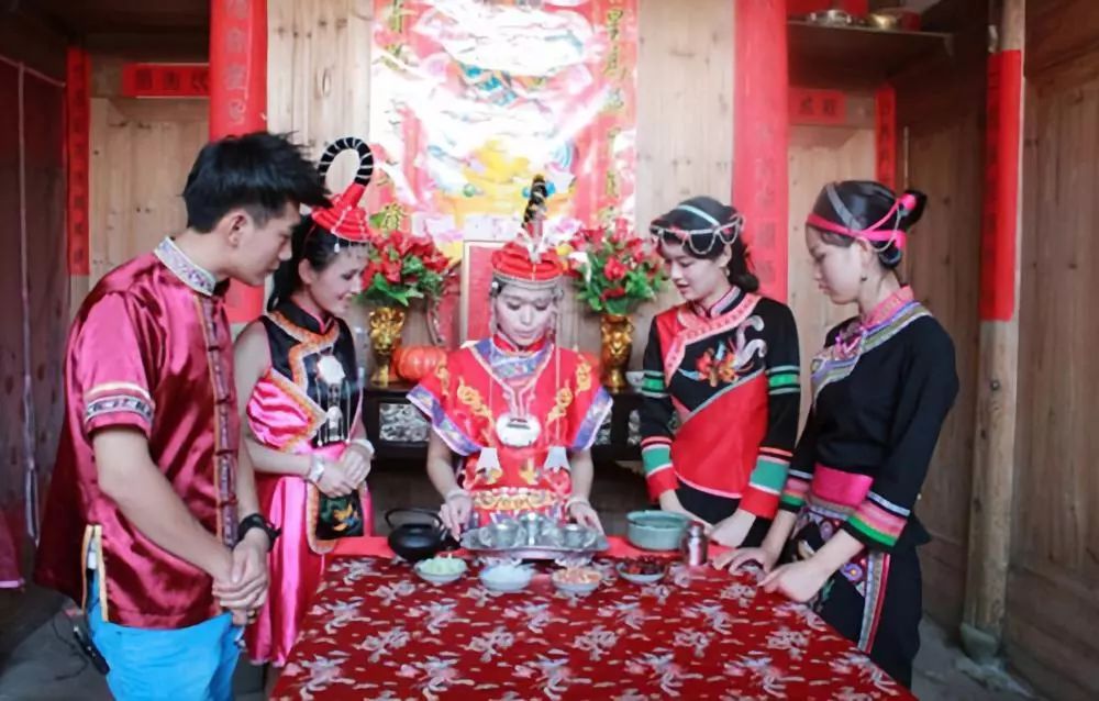 寶塔茶 畬族“寶塔茶”是福建福安畬族同胞在長期的生產(chǎn)生活中形成的一種獨具特色的婚嫁習(xí)俗。“寶塔茶”文化說的是,男方送來的禮品要一一擺在桌上展示。女方會取豬肉、禽蛋等過秤,男方一語雙關(guān)地問道:“親家嫂,有稱(有親)無?”親家嫂連聲答道:“有稱(有親)!有稱(有親)!”接著,女方用樟木紅漆八角茶盤捧出5碗熱茶,這5碗熱茶像疊羅漢式疊成3層:一碗墊底,中間3碗,圍成梅花狀,頂上再壓一碗,呈寶塔形,恭恭敬敬地獻給代表男方的“親家伯”品飲。親家伯品飲時用牙齒咬住寶塔頂上的那碗茶,以雙手挾住中間那3碗茶,連同底層的那碗茶,分別遞給4位轎夫,他自己則一口飲干咬著的那碗熱茶。這簡直是高難度的雜技表演!要是把茶水濺了或倒了,不但大伙無茶喝,還會遭到“親家嫂”的奚落。在獻茶時,通常還有一段對歌習(xí)俗。