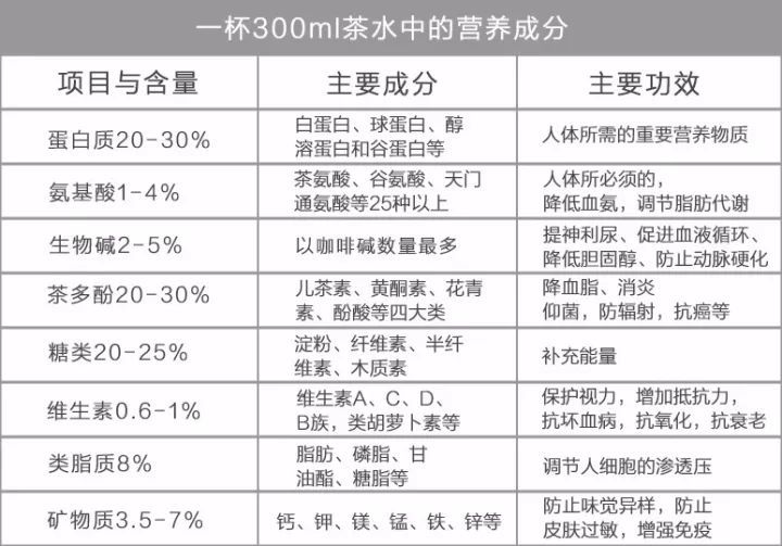 據(jù)科學(xué)家分析和鑒定,茶葉中含有300多種對(duì)人體有益的化學(xué)成分。其中包含大量的蛋白質(zhì)、氨基酸、脂肪、碳水化合物、礦物質(zhì)、微量元素以及維生素,其中維生素多達(dá)10余種,泡茶時(shí)多數(shù)可溶解在水中,能被充分利用。