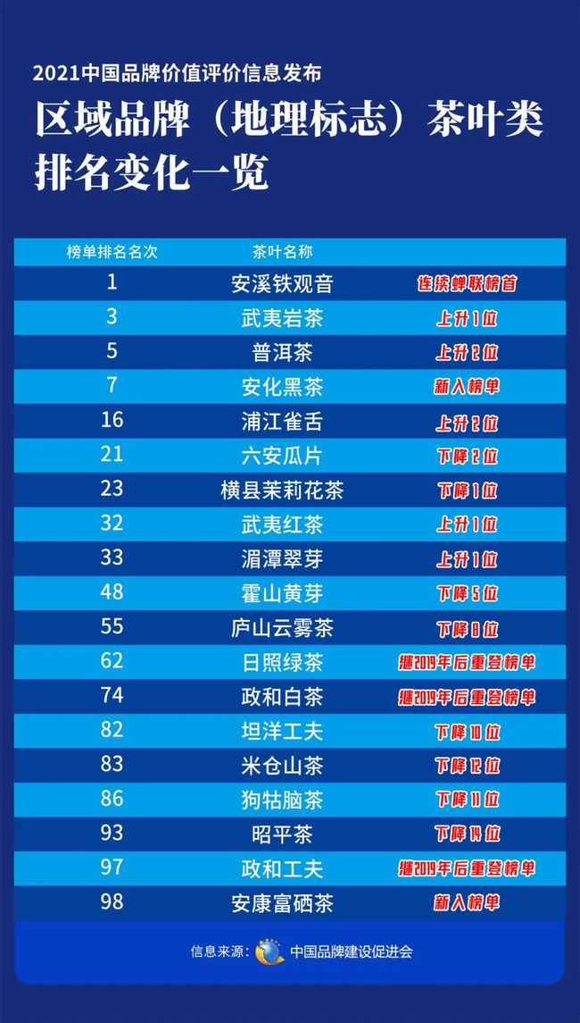5升8降!2021中國品牌價值評價信息發(fā)布 區(qū)域品牌(地理標(biāo)志)茶葉類排名變化一覽