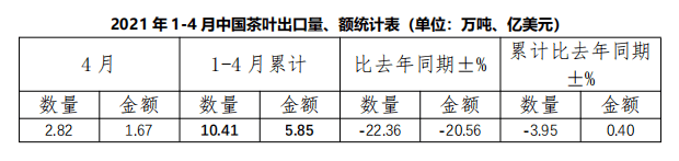 2021年1-4月,中國茶葉累計(jì)出口量為 10.41萬噸,同比減少3.95%,出口額為5.85億美元,同比增長(zhǎng)0.40%,1-4月出口均價(jià)為5.62美元/千克,比去年同期上漲4.54%。