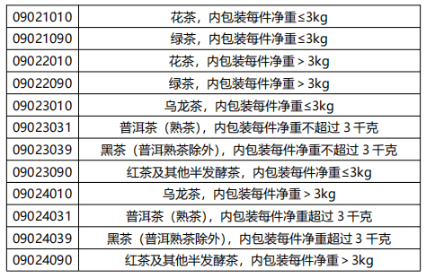 2020年12月,國務(wù)院關(guān)稅稅則委員會(huì)對(duì)茶葉類進(jìn)出口稅號(hào)進(jìn)行了調(diào)整,新增黑茶出口稅號(hào)類目,調(diào)整后茶葉進(jìn)出口商品編碼及商品名稱信息如下:
