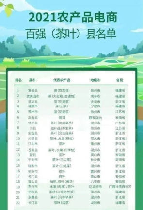 日前,農(nóng)業(yè)農(nóng)村部管理干部學(xué)院、阿里研究院聯(lián)合發(fā)布《農(nóng)產(chǎn)品電商出村進(jìn)城研究:以阿里平臺(tái)為例》報(bào)告和2021農(nóng)產(chǎn)品電商百?gòu)?qiáng)縣名單,其中茶葉類縣市22個(gè)入選,廣東省饒平縣是廣東省唯一上榜縣市。